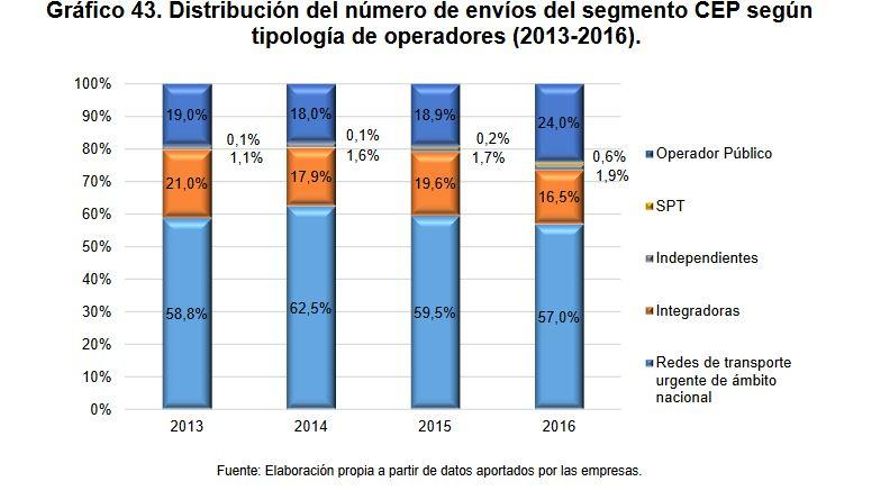 En cuanto al número de envíos por tipo de operador, una de las tendencias que destaca Competencia es “el aumento de cuota del operador público [Correos] desde el 19,0% que tenía en 2013 al 24,0% que tiene en 2016”. La porción de la tarta que se lleva el grupo público en el sector es cada vez mayor, en detrimento del resto de operadores. Su potencia y estructura para repartir a lo largo y ancho del territorio nacional es visto con temor por algunas distribuidoras privadas, reconoce Mario Murillo. En UGT, Sayagués van más allá: “Hay cierta presión de lobbies de paquetería a la Administración para que Correos no tenga los recursos suficientes en materia de paquetería”.