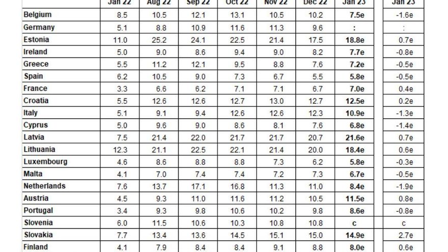 España sigue siendo el país de la eurozona con una menor tasa de inflación junto con Luxemburgo. La tasa interanual de los dos países se sitúa en el 5,8% frente al 8,5% que registró el conjunto de los estados de la zona euro en enero de 2023, según los datos preliminares adelantados por Eurostat este miércoles. La subida de los precios se relajó, no obstante, siete décimas respecto a la tasa de hace un año, que se situó en el 9,2%. En las instituciones europeas consideran que ya se ha llegado al pico de inflación, ya que se suman tres meses a la baja desde el récord alcanzado en el mes de octubre, cuando los precios se dispararon hasta el 10,6%.
