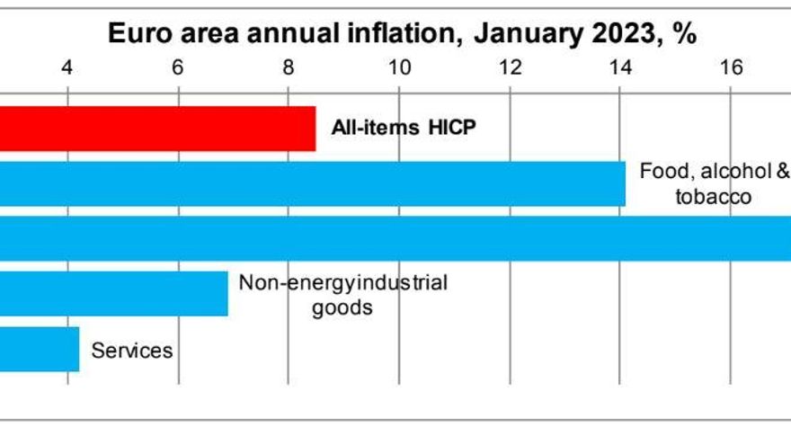 Por sectores, la energía sigue siendo el que tiene una mayor tasa interanual en la eurozona al situarse en el 17,2%, ocho puntos menos que el mes pasado, es decir, que el precio de la energía sigue subiendo menos que el año pasado y también que en el mes de diciembre (la caída es de nueve décimas en ese caso). La reducción se debe a las medidas que se han puesto en marcha para combatir la crisis energética. La comida, el alcohol y el tabaco también aumentan (un 14,1%). En este caso, el crecimiento es superior que en diciembre, cuando la tasa interanual se situó en el 1,38%.