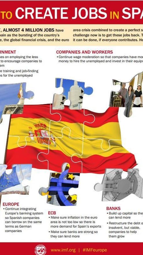 En el resto de paquetes de medidas para mejorar el empleo, el FMI propone reducciones a las cotizaciones sociales para los empleados menos cualificados y mejorar la formación activa. Estas insistencias a seguir ajustando salarios chocan con el reconomiento que hace el FMI del ajuste que ya se ha hecho. El organismo dice que el cambio tan espectacular que ha hecho España para dar la vuelta a la balanza por cuenta corriente (la que mide si se exporta más que lo que se importa) solo es comparable a la que llevó a cabo Corea del Sur en la época de la industrialización. Eso sí, Seúl lo hizo por la vía de devaluar su moneda y España lo ha conseguido por la vía de devaluar los salarios.