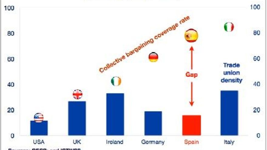En párrafos anteriores, y en un sesgado gráfico, los autores del informe lamentan la “baja representatividad de la negociación colectiva en España”, donde “los sindicatos solo representan a una parte de los trabajadores -típicamente aquellos que tienen trabajo (sic), pero donde los acuerdos de negociación colectiva cubren a casi todos los trabajadores”. También plantea que se hagan descuelgues como los que se hicieron a principios de los noventa en Alemania en algunos sectores.