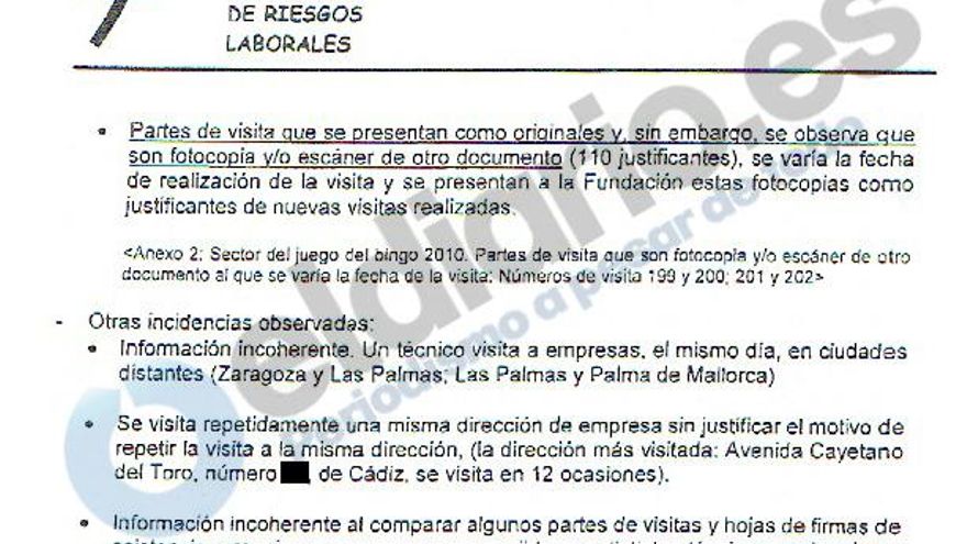 El lío se remonta al año 2012. Ese es el ejercicio al que corresponden las irregularidades que detecta la Fundación en los justificantes entregados por parte de los encargados de hacer la prevención en el sub-sector de los bingos. La fundación cree que le entregan fotocopias en lugar de originales, y que además estas están manipuladas. Además, aseguran, la información es incoherente. Ven que el mismo técnico realiza visitas el mismo día en Zaragoza y en Palma de Mallorca. Se visita hasta en 12 ocasiones una sala de Bingo en la Avenida Cayetano del Toro en Cádiz. Los técnicos están haciendo cursos en Madrid el mismo día que dicen estar de visita en Bilbao...