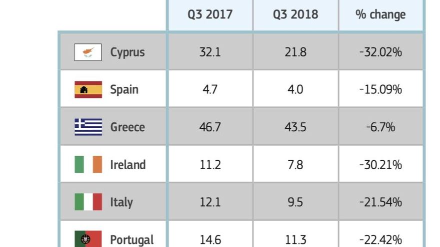 En el caso de España, la proporción de préstamos dudosos se redujo siete décimas en el tercer trimestre de 2018 con respecto al tercer trimestre de 2017: del 4,7% al 4%, según el informe de la Comisión Europea.