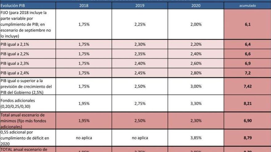 Las subidas fijas pactadas son de 1,75% (2018), de 2,25% (2019) y de 2% (2020). Este suelo se puede incrementar por varias vías. Por un lado, en concepto de los mencionados fondos adicionales se puede añadir en algunos ámbitos un +0,20%, +0,25% y +0,30%, entre 2018 y 2020. Por otro lado, si el PIB crece por encima del 2,5% en 2019 se sumaría hasta un 0,25% en 2019 y hasta un 1% en 2020. “Las retribuciones ligadas a los objetivos del PIB se abonarán con efectos de 1 de julio de cada ejercicio”, especifica el acuerdo.