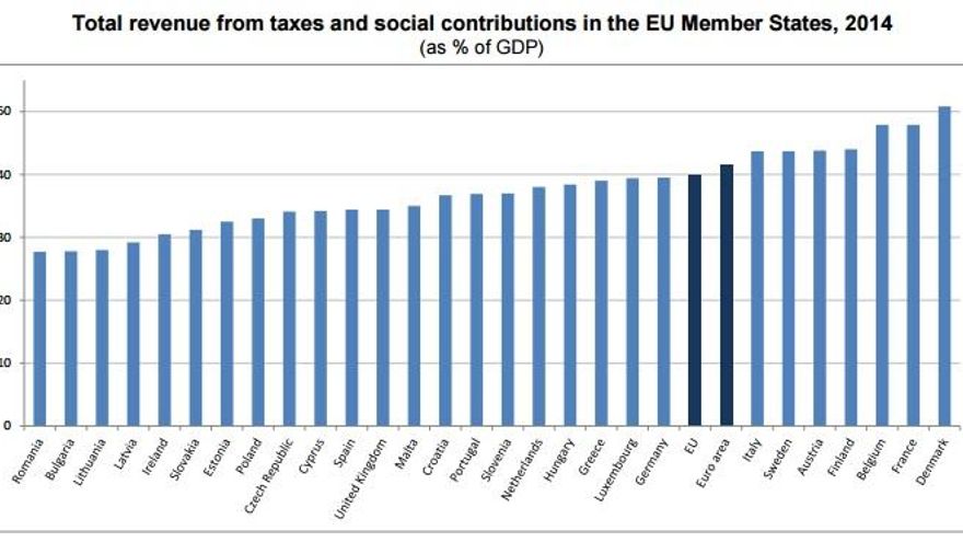 Según la oficina estadística europea, la presión fiscal (impuestos y cotizaciones sociales) se situó en España en 2014 (último dato disponible) en el 34,4% del PIB, bastante por debajo de la media de la UE (40%) y de la zona del euro (41,5%). Por categorías, en España los impuestos a la producción y las importaciones (como el IVA) recaudan el 11,6% del PIB; los impuestos a la riqueza (IRPF y Sociedades), el 10,1%; y las cotizaciones sociales, el 12,5%. En todos los casos, menos que la media de la UE y que en muchos de los países europeos más ricos.