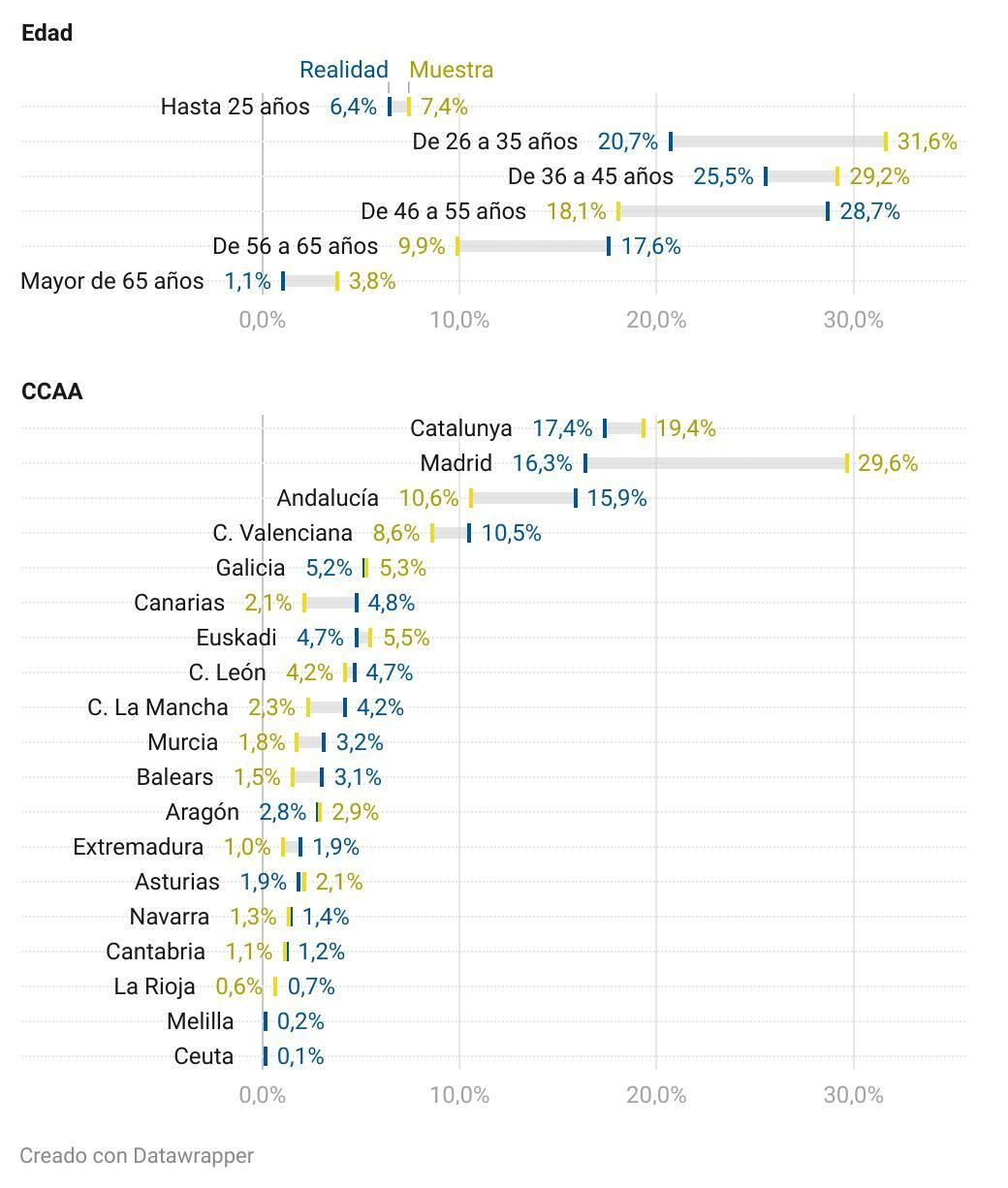 Este sesgo en la muestra tiene muchas posibles explicaciones. En primer lugar, por la sobrerrepresentación de comunidades más ricas como Madrid y Catalunya, que copan la mitad de las respuestas mientras solo representan un tercio de los asalariados en el mercado laboral.