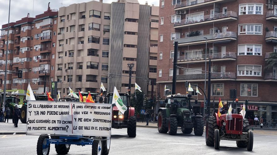 Los manifestantes han recorrido las calles del centro de Murcia tras una pancarta en la que se ha podido leer el lema: “Si el labrador se arruina y ya no puede labrar, ¿qué guisarás en tu cocina para poderte alimentar? A unos céntimos he vendido, cada vez más arruinado, me quedo sorprendido de lo que vale en el mercado”.