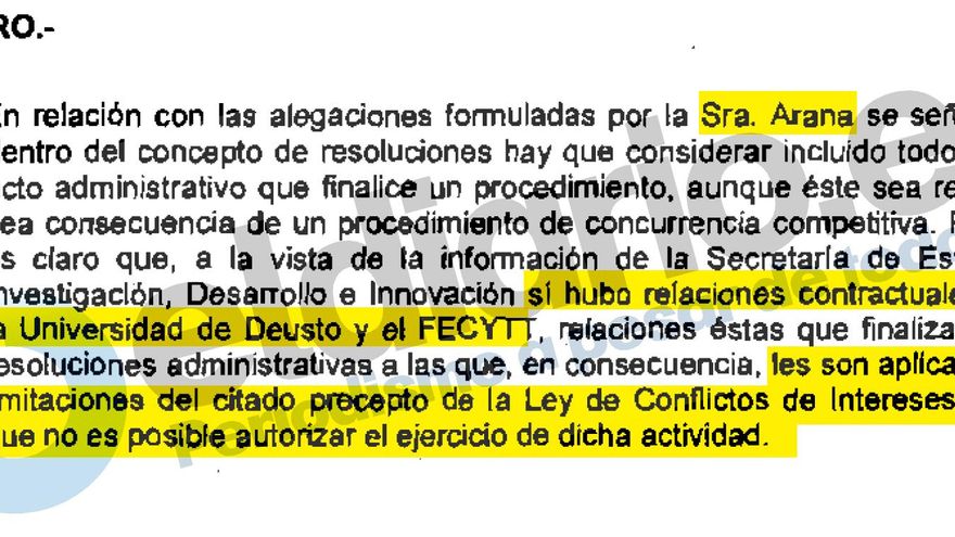 Lourdes Arana, ex directora general de la Fundación Española para la Ciencia y la Tecnología (FECYT), recibió la negativa del Gobierno para incorporarse como directora en la Universidad privada de Deusto. La Oficina determinó que la nueva actividad era contraria a la ley de conflicto de intereses, ya que la FECYT había adjudicado a la universidad cuatro contratos por 14.000 euros y una ayuda de 20.000 durante su periodo como máxima responsable de la entidad pública.