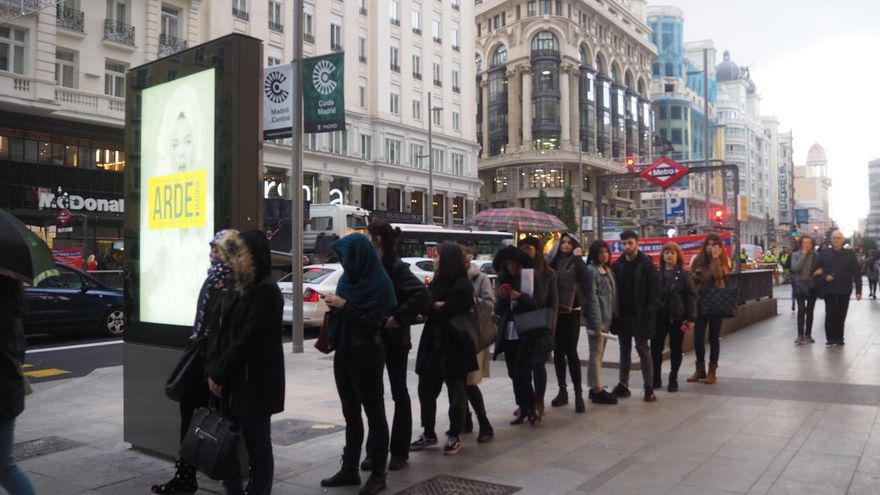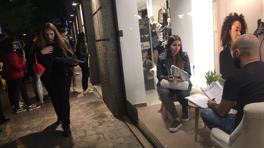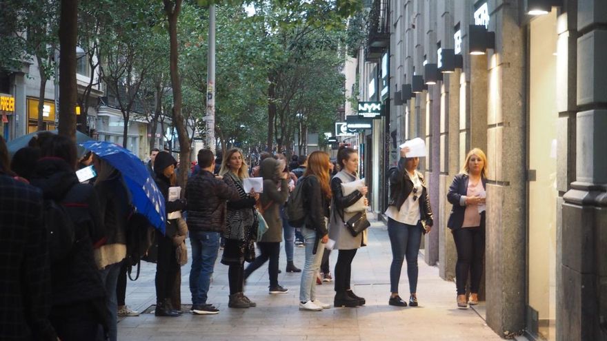 La mayoría no salía de su asombro: enviaron su candidatura a través del portal Infojobs, por internet, y la empresa convocante les citó este jueves a las cuatro de la tarde en la céntrica calle Fuencarral de Madrid. Lo que no sabían era que como ellas habría tantas otras, que tendrían que esperar más de cuarenta minutos hasta llegar a la puerta y que la entrevista no sería grupal, sino individual, y en el escaparate. Dos encargadas de la tienda esperaban, cada una en una mesita, a que fueran pasando para mantener charlas de 2 o 3 minutos.