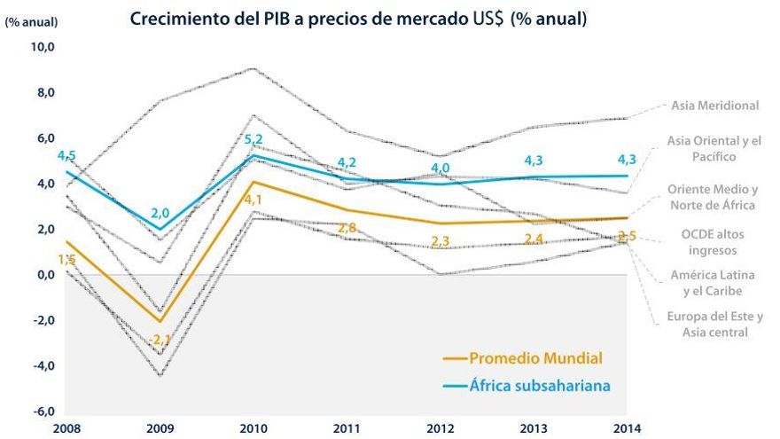 Sí. Pese a que como hemos visto en el gráfico anterior aún no tiene una cuota amplia en la economía global, los datos del Banco Mundial cifran su última tasa de crecimiento a nivel global en un 4,3% en 2014. Puesto en comparación con el promedio mundial, se sitúa casi dos puntos por encima al marcar un 2,5%.