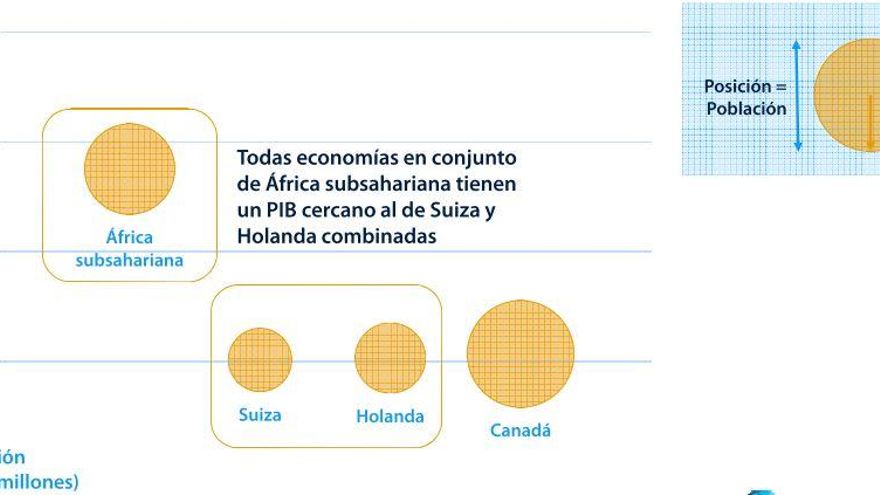 No. Pese a los avances que están llevando a cabo en los últimos años, el conjunto de las economías nacionales del África subsahariana siguen sin tener una cuota importante a nivel global. El gráfico posterior muestra de manera clara como su PIB concuerda más o menos con el tamaño combinado de las economías suiza y holandesa, e inferior a la canadiense.