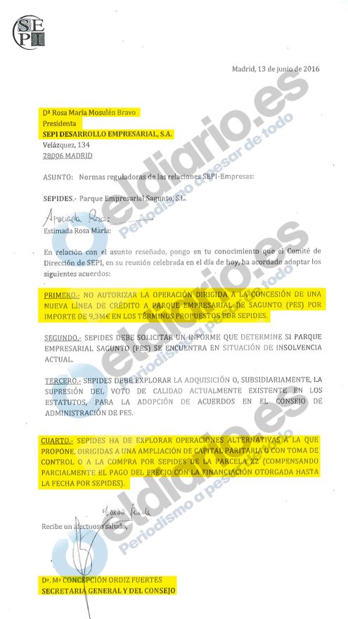 Con su rechazo a la permuta, Gallardo se ciñó a las instrucciones expresas que había recibido Mosulén del Comité de Dirección de SEPI el pasado 13 de junio, cuando el hólding público, que depende del Ministerio de Hacienda, comunicó a la presidenta de Sepides que no debía aportar más fondos a PES (le denegó una nueva línea de crédito de 9,3 millones) y le instó a buscar “operaciones alternativas” a la permuta de suelo. Entre ellas, una ampliación de capital en la que aportasen fondos por igual Sepides y la Comunidad Valenciana.
