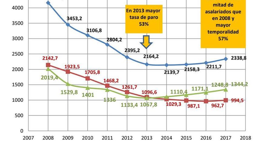 Las cifras anuales de la Encuesta de Población Activa (EPA) muestran que todavía en 2017 hubo de media más desempleados que en 2008. Aunque el número de parados ha descendido en gran medida tras el máximo alcanzado de 2012 –con 1.770.400 jóvenes en esta situación–, en 2017 había aún 1.063.100 jóvenes desempleados. La cifra es superior, aunque por poco, a la del inicio de una década anterior: 1.012.100.