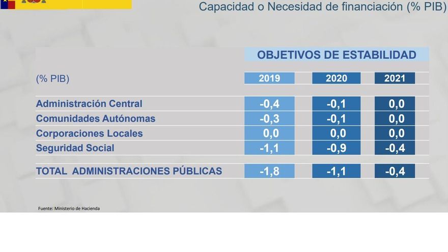 En total, estas cinco décimas conllevarán un aumento de los recursos de 6.000 millones de euros: 2.500 millones para CC.AA., 2.500 millones para Seguridad Social y 1.000 millones para Administración Central. De este modo, la previsión del Gobierno es que las comunidades presenten un déficit del 0,3% el próximo año; la Administración Central, del 0,4%, y la Seguridad Social, del 1,1% del PIB. Las corporaciones locales, por su parte, estarán en equilibrio.