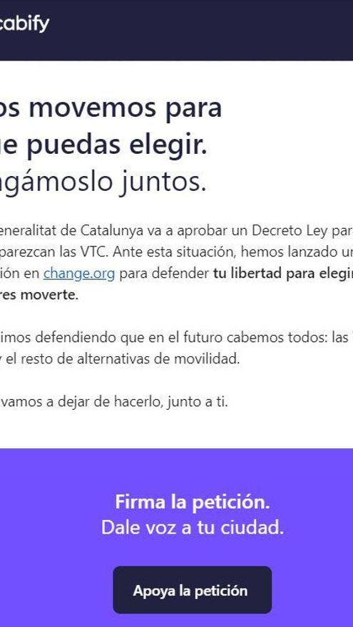 Los clientes de Uber y Cabify están recibiendo en sus correos un mail de estas compañías de VTC en la que se pide la firma en la plataforma change.org para paralizar el decreto de la Generalitat para “hacer desaparecer a las VTC de Catalunya. Un Decreto a medida del sector del taxi para expulsar a Uber y Cabify de Barcelona”. La nueva norma que fija una precontratación de 15 minutos para los servicios de empresas como Uber o Cabify.