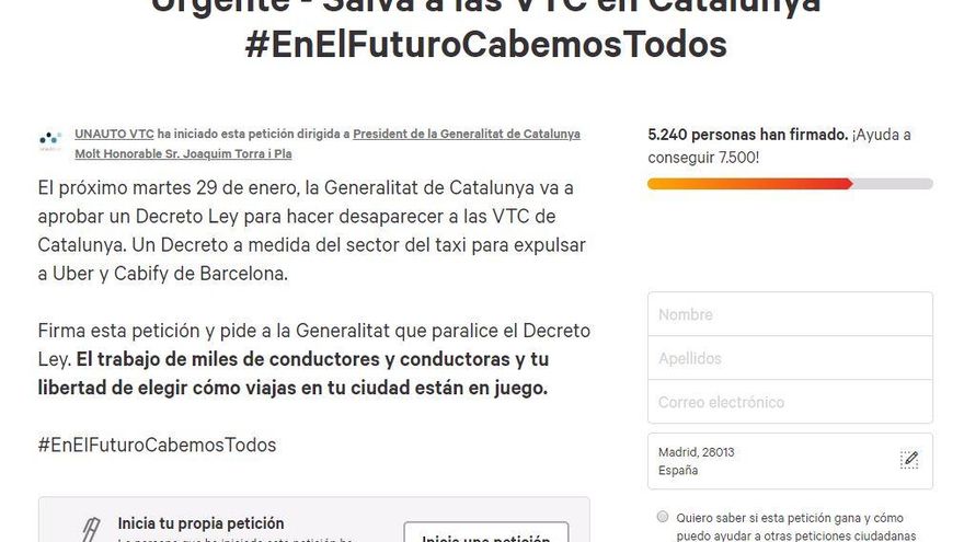 La campaña de firmas tiene como objetivo conseguir 7.500 apoyos, a las 14:00 de este jueves había alcanzado las 5.240 firmantes. Este tipo de campaña no es vinculante. Eduardo Martín, presidente de la asociación Unauto, había hecho un último llamamiento a la Generalitat a modificar su decreto para que retire el tiempo de reserva de las VTC. Martín ha insistido en que la norma conllevará un “despido masivo” entre los más de 3.000 trabajadores del sector, y ha advertido de que pedirán indemnizaciones a la Generalitat por valor de 1.100 millones de euros.