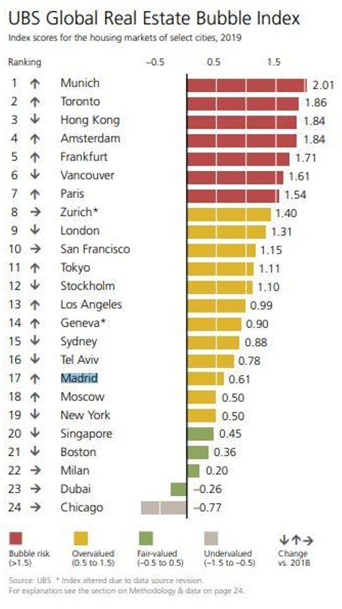 Según aseguran, los bajos tipos de interés han alentado “la burbuja en la Eurozona”, llevando a cuatro ciudades europeas (París, Fránkfurt, Múnich y Ámsterdam) a territorio de riesgo. Las otras ciudades en este grupo de peligro para UBS son Toronto, Hong Kong y Vancouver.