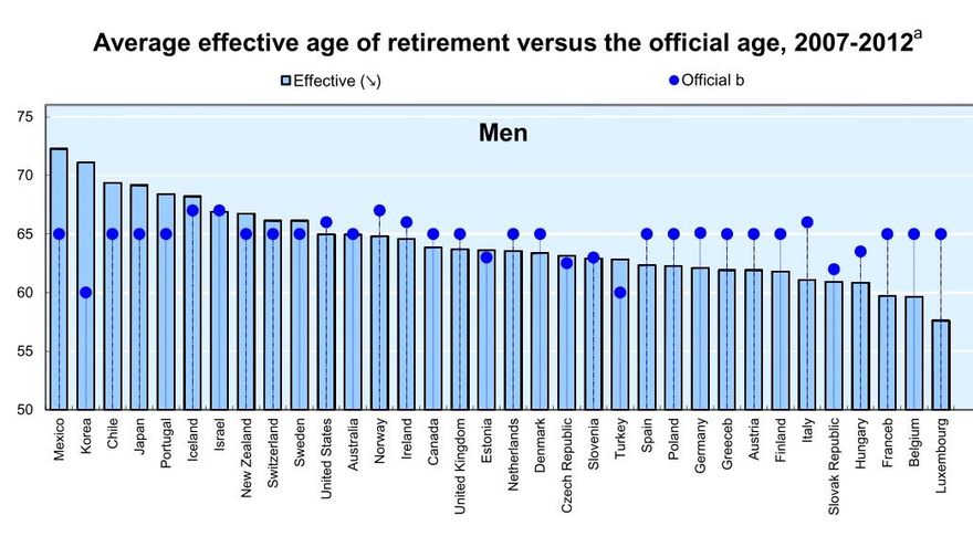 Sin embargo, desde el prisma de la edad real de jubilación, las diferencias no son tan marcadas. Los últimos datos disponibles con comparación internacional los registra la Organización para la Cooperación y el Desarrollo Económico (OCDE). En su informe Pensions at a Glance (las pensiones de un vistazo), la OCDE compara las edades efectivas de jubilación por lustros. En el periodo 2007 a 2012, los españoles (hombres) se retiraron de media a los 62,3, más tarde que Alemania, Finlandia o Austria. De hecho, una edad efectiva como la anunciada por la ministra (en el supuesto de que afectara solo a los hombres), se aproximaría a la de Dinamarca, uno de los países europeos que más años trabajan o a Reino Unido.