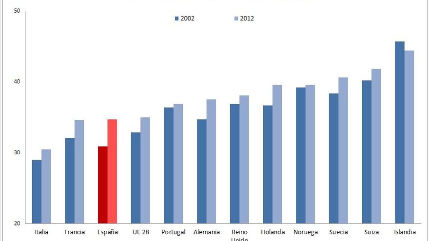 Con la nueva estimación, España aparece como uno de los países con la vida laboral más corta de sus trabajadores. De media, los españoles que accedieron a la jubilación habían trabajado 34,7 años en 2012, frente a las largas vidas laborales de otros países europeos. En Islandia (que no está en la UE), trabajan 44,4 años de media, seguidos por los suizos (tampoco en la UE), que están en el tajo 41,8 años y los suecos (están en la UE pero no en el euro) que superan los 40,6 años.