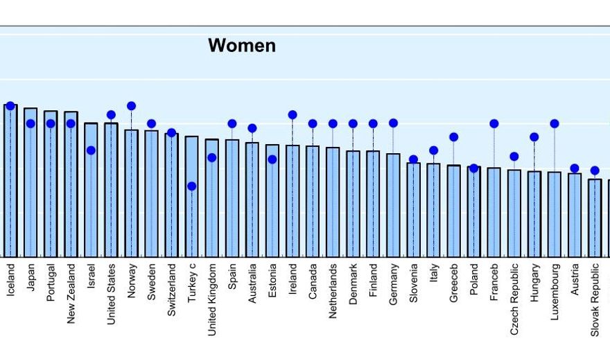 Si tenemos en cuenta la edad de jubilación de las mujeres (la OCDE ofrece los datos desagregados por sexos), España es una de las 34 economías ricas del planeta que más tarde accede a la jubilación. Así, entre 2007 y 2012, las españolas se retiraron de media con 63,2 años, más tarde que sus vecinas holandesas, alemanas, danesas y en general de cualquier economía occidental.