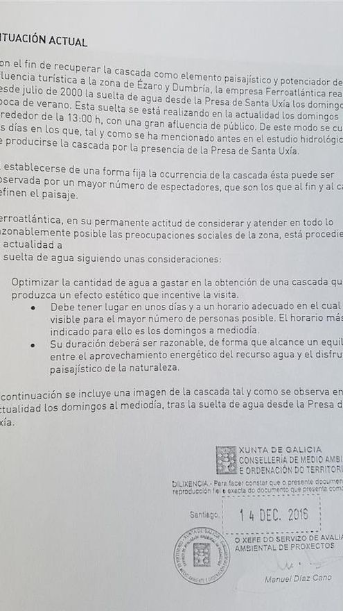 El informe que Ferroatlántica presentó a la Xunta para justificar que el río Xallas no precisaba en su desembocadura un caudal mínimo tiene fecha de 3 de agosto de 2000 y algunos párrafos irrepetibles. En su página 18 la empresa defiende las bondades de la catarata turística. Lo que sigue es la transcripción literal de uno de los argumentos del documento oficial presentado por la empresa de Villar Mir y que el Gobierno gallego avaló: “Al establecerse de una forma fija la ocurrencia de la cascada, esta puede ser observada por un mayor número de espectadores, que son los que al fin y al cabo definen el paisaje. Ferrroatlántica, en su permanente actitud de considerar y atender en todo lo razonablemente posible las preocupaciones sociales de la zona, está procediendo en la actualidad a la suelta de agua siguiendo una consideraciones: