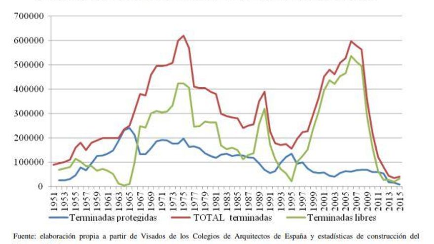 La evolución de la construcción de viviendas libres y de protección oficial (VPO) en España representa grandes oscilaciones. Entre 1959 y 1965, años del desarrollismo, un 70% de las viviendas construidas eran protegidas y en el 1963 alcanzaron el 90%, según Carme Trilla, economista y especialista en mercado y políticas de vivienda.