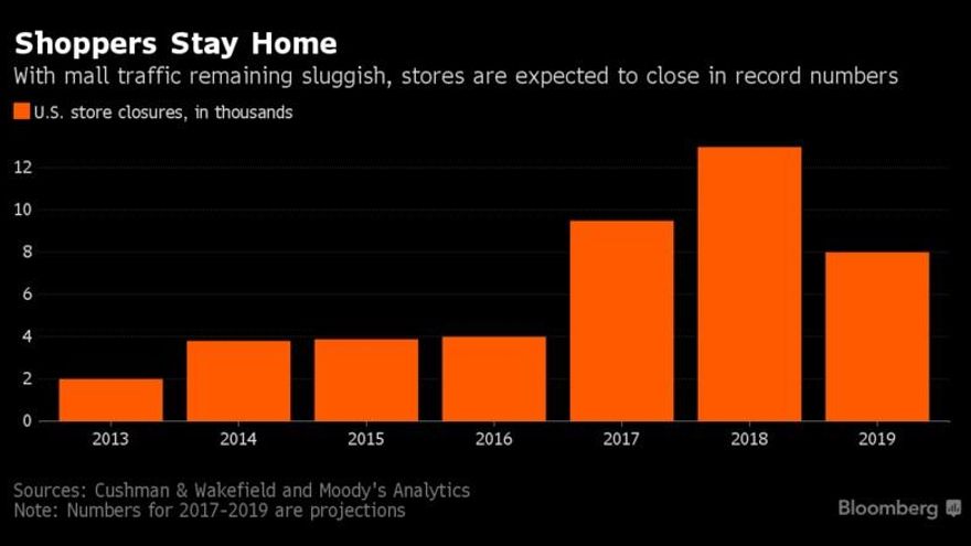 En mayo, Credit Suisse pronosticaba el cierre del 25% de estos centros, unos 275, de aquí a 2022, y la clausura, sólo en 2017, de unas 8.640 tiendas en todo el país. Una cifra sin precedentes que Cushman & Wakefield eleva hasta las 13.000 para 2018, según estimaciones difundidas por Bloomberg el pasado jueves.