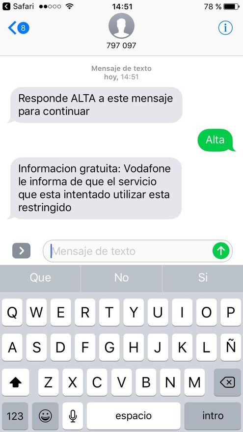 Para prevenir este tipo de estafas, es recomendable pedir a nuestro operador de telefonía móvil restringir el acceso a servicios premium. En el caso de que el usuario ‘pique’, recibirá en su teléfono un mensaje como este: