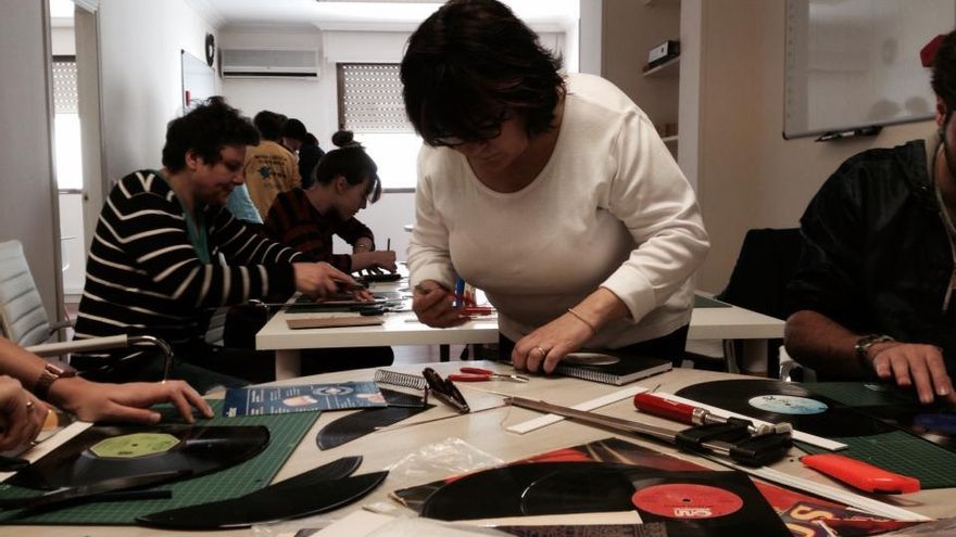 Varias tiendas de música les donaron el material que ya no querían y llegaron a la conclusión de que con ellos podían elaborar cuadernos y agendas. La encargada de impartir el primer taller sería una de las socias y empezaron a dar a conocer el proyecto para poder llegar a los desempleados que pudieran estar interesados. “Hicimos algunos folletos y movimos las convocatorias por las redes sociales ante la imposibilidad de poder anunciar la iniciativa en las oficinas del Inem”, señala Laporta.
