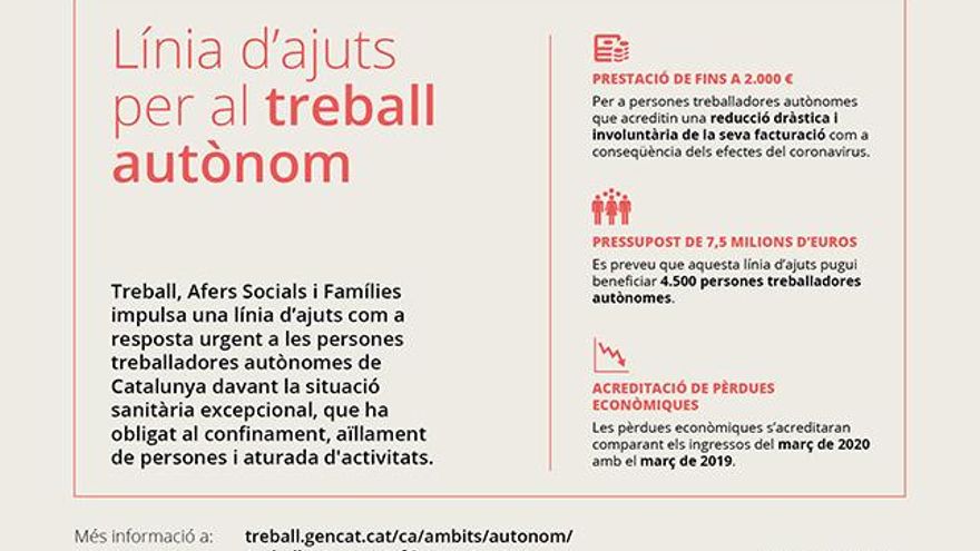 El Departament de Treball, Afers Socials i Famílies ha posat en marxa una nova línia d’ajudes per donar suport als treballadors i treballadores autònoms que hagin patit una reducció dràstica i involuntària de la seva facturació com a conseqüència dels efectes del coronavirus. Es tracta d’una prestació econòmica de fins a 2.000 euros, que podran percebre sempre que figurin d’alta en activitats de les quals les autoritats sanitàries han decretat el tancament i no disposin d’altres fonts alternatives d’ingressos.
