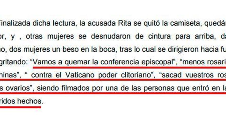 En la sentencia de la Audiencia Provincial de Madrid, del 16 de diciembre de 2016, se incluyen las expresiones utilizadas por Rita Maestre cuando entró a la Capilla del Campus de Somosaguas de la Universidad Complutense de Madrid el día 10 de marzo de 2011. Entre ellas están: “vamos a quemar la conferencia episcopal”, “menos rosarios y más bolas chinas”, “contra el Vaticano poder clitoriano”, “sacad vuestros rosarios de nuestros ovarios”. En ella se especifica, incluso, que estos gritos fueron “filmados por una de las personas que entró en la capilla”.