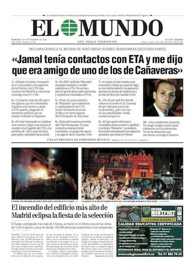 “Mientras El Mundo pague, yo les cuento la Guerra Civil”, dijo el propio Trashorrras a sus padres en una conversación desde la cárcel, previa a esa entrevista donde, en efecto, cantó las batallitas que El Mundo quería escuchar. Que sea ahora este mismo diario el que acuse a los sindicatos y a Pilar Manjon –portavoz de la asociación mayoritaria de las víctimas del 11-M– de utilizar el atentado contra el Gobierno a cuenta de la reforma laboral es solo una indecencia más. Hace bueno este famoso verso de Machado: “El más truhán se lleva la mano al corazón”. Siempre es así.