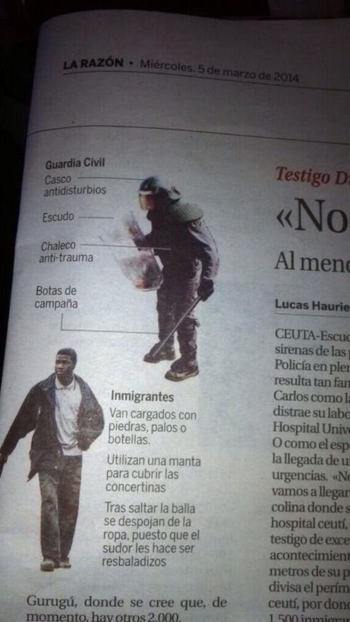 ¿El Álamo? ¿El Alcázar de Toledo? ¿La Batalla de las Termópilas donde 300 aguerridos espartanos detuvieron al ejército imperial persa de Jerjes? No. Es Ceuta, en el increíble mundo paralelo de La Razón, que no solo asume sin preguntar la burda propaganda del Ministerio del Interior, sino que la mejora para presentar el “asalto” como toda una invasión. Atentos a la portada, y a la infografía que acompaña el interior.