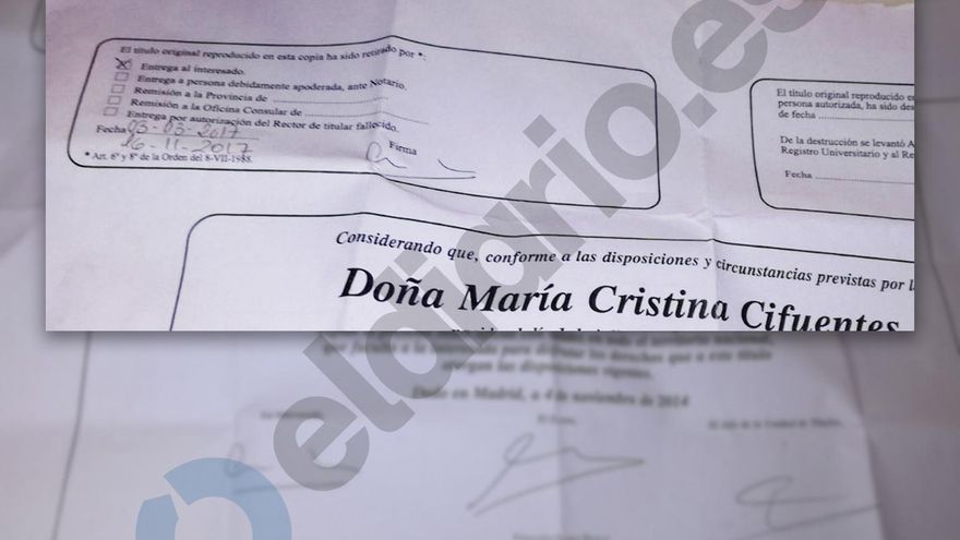 Ese 3 de marzo, Cristina Cifuentes estuvo en la Universidad y allí coincidió con Amalia Calonge. Fue ese día cuando Cifuentes firmó el recibí para recoger su título, pero no se lo llegó a llevar. Según confirman fuentes de la propia Universidad, Cifuentes encargó a Calonge que lo retirase en su nombre con este resguardo con su firma.
