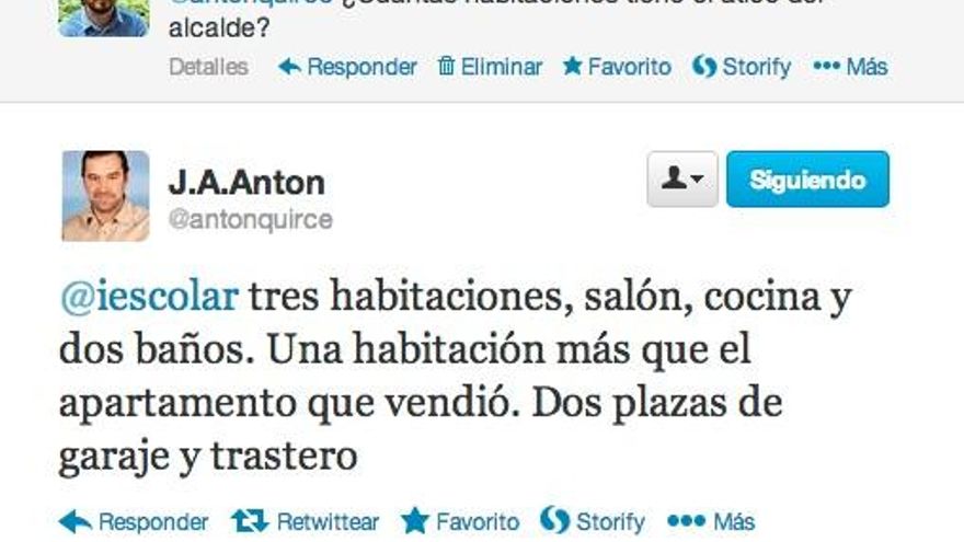 ¿Cuántos dormitorios tiene el ático del alcalde de Burgos, Javier Lacalle? Desde el Ayuntamiento, nadie da una respuesta oficial. Pero el concejal de Fiestas y Nuevas Tecnologías de Burgos, José Antonio Antón Quirce, confirmó ayer, a través de su cuenta de Twitter, que el polémico ático no coincide con lo que aparece escriturado en el Registro de la Propiedad. Según el concejal, que también es amigo personal de Lacalle, la vivienda del alcalde tiene “tres habitaciones, salón, cocina y dos baños”. “Yo he estado en ese piso. Doy fe”, asegura en otro mensaje.