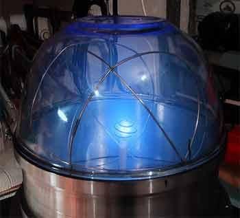 “Aquí se ve el fusor en funcionamiento. Debe observarse que la cúpula de cristal es una ensaladera de pirex, de coste 4 €.
