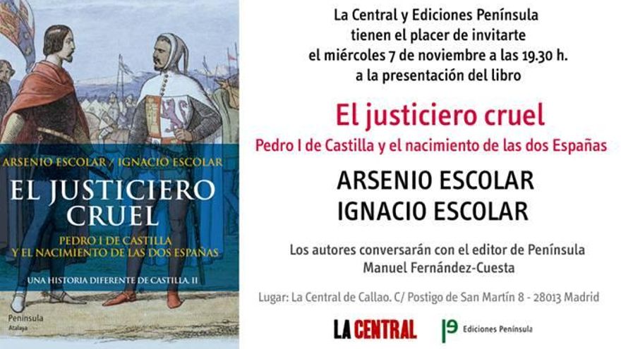 Esta tarde mi padre y yo presentaremos en Madrid nuestro nuevo libro: El justiciero cruel. Es la segunda parte de La nación inventada, nuestro ensayo sobre la historia medieval castellana. Se trata de una biografía de Pedro I de Castilla, uno de los reyes más polémicos de la Edad Media. Os dejo con el prólogo del libro. Espero que os guste. Por supuesto, estáis todos invitados a la presentación. La entrada es libre y gratuita hasta completar aforo.