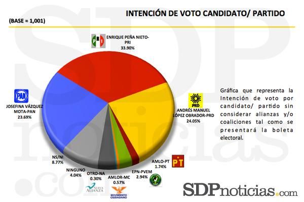 Casi todas las encuestas estaban dando al candidato del PRI, Peña Nieto, como gran favorito, seguido de Josefina Vázquez. La imagen del PAN ha quedado muy tocada por la sangrienta guerra contra el narcotráfico, que ha disparado la violencia en el país. Sin embargo, una última encuesta publicada en SDP Noticias asegura que López Obrador está ya en segundo lugar, empatado con la candidata del PAN, aunque aún muy lejos del PRI.