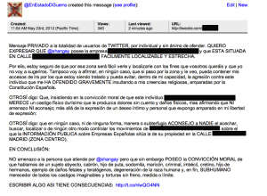 El activista por los derechos de los homosexuales Shangay Lily ha recibido esta amenaza directa e intolerable a través de Twitter, por medio de uno de esos servicios para mandar tuits más largos. El agresor que firma estas lindezas no es la primera vez que escribe estas cosas: es conocido –para mal– por muchos militantes de izquierdas, especialmente mujeres, a los que lleva meses insultando y amenazando impunemente. Hay ya varias denuncias presentadas. En este vídeo de La Tuerka recogen algunas otras de hace ya más de un mes, sin que haya pasado nada y sin que su cuenta de Twitter haya sido bloqueada. ¿Qué más hace falta para que este individuo sea detenido y puesto a disposición judicial? ¿Que alguna de estas amenazas se cumpla?