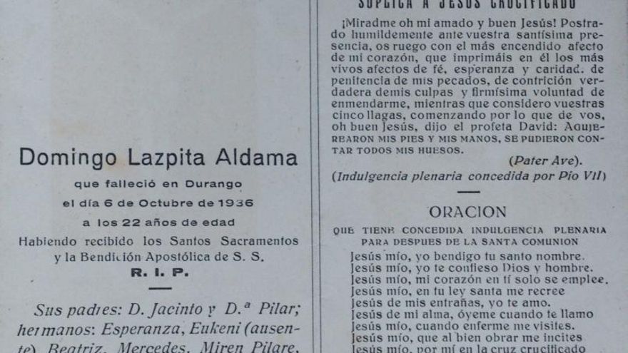 Lore Lazpita dejó registro de la memoria de su hermano mayor Txomin, que al igual que Daniel se alistó en el batallón Arana Goiri, si bien en fecha más temprana. Domingo “Txomin” Lazpita Aldama nació en noviembre del 1913 en el barrio ortuellarra de Bañales y era el segundo de los hermanos mayores. Su padre, Jacinto Lazpita, era natural de Berriz y la madre, Pilar Aldama, de Ortuella. Del matrimonio nacieron Esperanza, Txomin, Beatriz “Bea”, Mercedes, Miren Pilare, Joseba (que sería cura de Elguero), Félix, Miren Begoñe y la más pequeña Lore. Se trataba de una familia profundamente nacionalista y cristiana. Txomin era un buen mozo de ojos azules que, al igual que sus hermanos, había nacido en el nº13 de Bañales, una casa larga de tres pisos que había pertenecido a la familia Aldama en la que vivían hasta 12 vecinos en condiciones humildes que pagaban la renta al nuevo propietario, el doctor Agustín Royo. Antes de la guerra había comenzado a trabajar en la fundición de Talleres Ybarra —la fábrica más importante del municipio- y cuando volvía a casa, una vez acabada la jornada, Lore, la más pequeña de la familia, siempre salía a recibirle; Txomin cogía a la niña en brazos y la levantaba en alto, moviéndola de arriba a abajo mientras decía cariñosamente: “Sí conejin”. Lore solo tenía dos años. En los ratos libres que le dejaba el trabajo Txomin cuidaba la vaca del médico Royo. Para la madre “era casi más querido que el padre; era un gran hijo”. Uno de sus mejores amigos fue Genaro Mañarikua, que vivía en la misma casa, debajo de los Lazpita. Tal es así que Genaro y Txomin hicieron un agujero en la pared y montaron un teléfono para hablar de sus cosas. Ambas familias se llevaban estupendamente y tenían una relación muy estrecha.