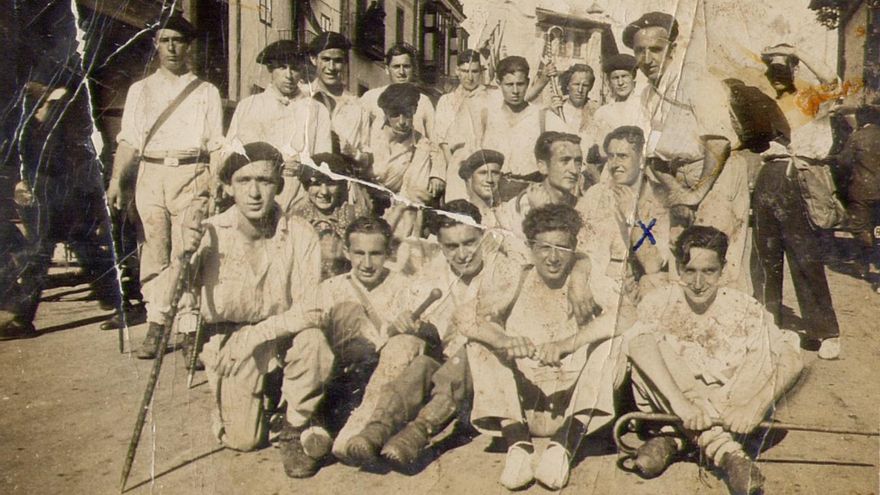 Bendición de la ikurriña de la compañía Kortabarria del batallón Arana Goiri en la basílica de Begoña. Marcado con una “X” el comandante Felipe Bediaga, que hallaría la muerte en el Saibigain al igual que el vecino de Nocedal Daniel Amezaga Ozerin, que sin duda también se encuentra en la imagen (Fondo Bidasoa/Sancho de Beurko, AHE).