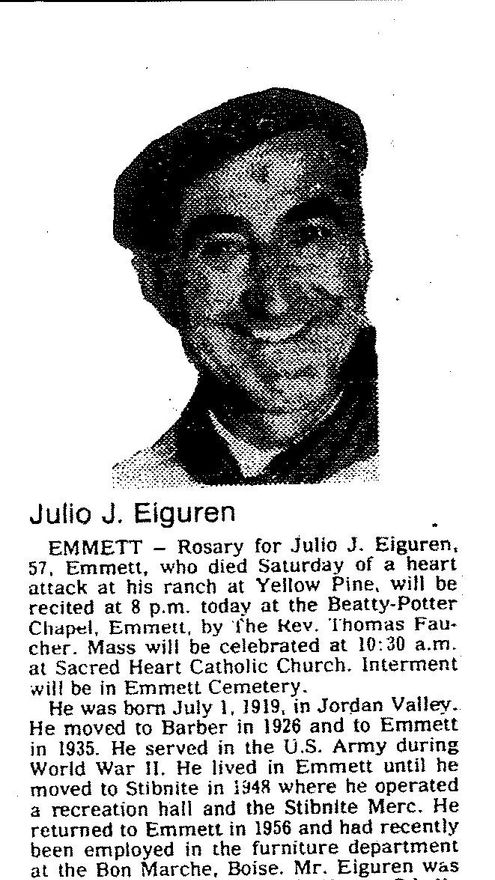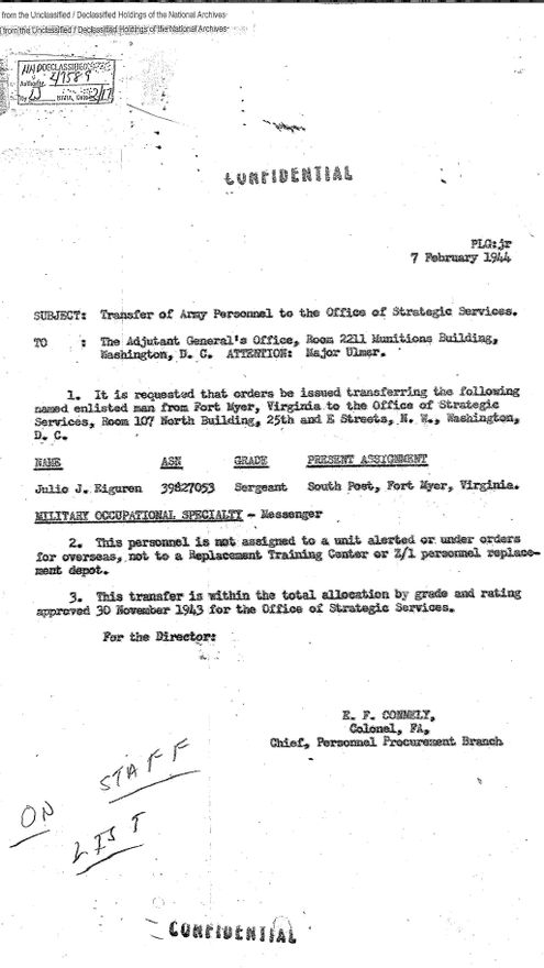 La invasión de Birmania (hoy en día Myanmar) —en manos del Imperio Británico desde 1886-, por parte del Imperio del Sol Naciente a finales de diciembre de 1941 fue otro golpe estratégico militar de gran relevancia contra el dominio de las potencias aliadas en el sureste asiático. Los británicos capitularían en abril de 1942, pasando Birmania a ser una pieza clave en el tablero militar japonés en un intento final de subyugación de China y de preminencia en la región. Mientras los vasco-nevadenses de las Fuerzas Aéreas estadounidenses Joseph Malaxechevarria Plaza, Santy Arriola Onandia, John Montero Bidegaray y Domingo Arangüena Bengoa sobrevolaban heroicamente los cielos de Birmania, en la extremadamente peligrosa ruta entre India y China, en el sur del país era desplegado, a finales de 1944, el agente secreto de la Oficina de Servicios Estratégicos (OSS) —la primera agencia centralizada de inteligencia en el extranjero en la historia de Estados Unidos (EEUU)-, Julio Eiguren Bermeasolo, nacido en 1919 en Jordan Valley (Oregón) de padres vizcaínos. Dos años antes de la creación de la OSS, el 13 de abril de 1942, Eiguren se había alistado en el ejército en la ciudad de Boise, Idaho. Durante dos meses asistió al Centro de Entrenamiento de Reemplazo de la Policía Militar en Fort Riley (Kansas), que fue establecido en abril de 1942 para formar soldados y policías militares para el reemplazo de las pérdidas en el extranjero. El 8 de junio sería trasladado a South Post, Fort Myer (Virginia). Su especialidad militar ocupacional era la de “mensajero”.
