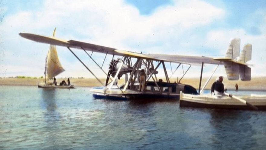 El Sikorsky S-38 Silver Wings de Margery Durant en Mersa Matrouh (Egipto) durante su segundo viaje a África en 1932. Ella puede verse en la parte trasera del aparato. Las placas fueron coloreadas a mano por el reconocido fotógrafo Edward van Altena (https://www.airspacemag.com/daily-planet/margery-durant-post-180971668/).
