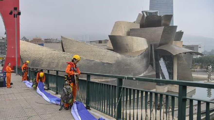 Espectacular acción de denuncia de Greenpeace frente la museo Guggenheim de Bilbao. Cinco activistas de este grupo ecologista -dos mujeres y tres hombres- se han colgado esta mañana desde el puente de La Salve de Bilbao y han desplegado una pancarta de 250 metros cuadrados con el lema 'Los océanos importan'. Coincidiendo con el 'Día Mundial de los Océanos', la organización ecologista advierte de que “en los mares se encuentran algunos de los ecosistemas más vulnerables del planeta y que es necesario mejorar su protección, por ejemplo, a través de la creación de Reservas Marinas y una gestión pesquera que favorezca la pesca sostenible”.