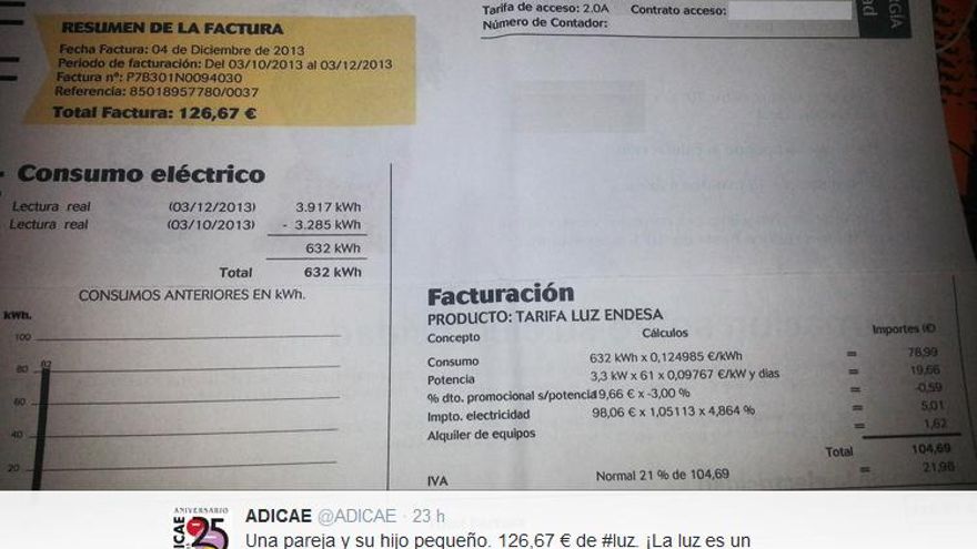Las asociaciones de consumidores llevan tiempo recibiendo quejas de los usuarios que reflejan el malestar de los ciudadanos con la subida del recibo de la luz. El departamento de Consumo de Adicae ha puesto en marcha una campaña de recogida de facturas -en info@adicae.net- para visibilizar los casos de particulares que se enfrentan a unas subidas que en muchos casos “no entienden” e incluso “no pueden afrontar”, apuntan desde la organización. Otra medida que han puesto en marcha es la recogida de firmas para reclamar al Ministerio que retiren la reforma energética porque según afirman “la gente está concienciada con que hay que reformar el sistema eléctrico, pero no con la reforma propuesta”. Entre las facturas recibidas hay casos como el de un usuario que a pesar de tener su casa cerrada ha recibido una factura de 26 euros, o el de una pareja con un hijo que el pasado mes se sorprendió con más de 126 euros de consumo, tal y como denunció en twitter la asociación de consumidores.