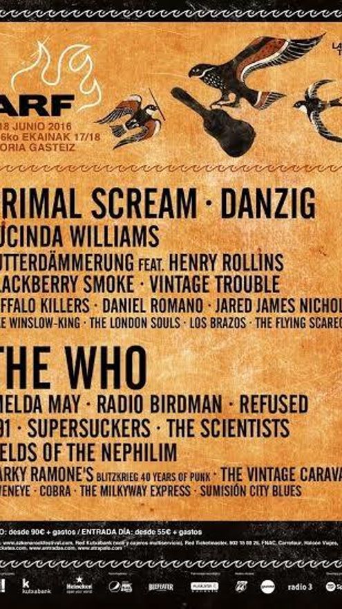 El Azkena es el primero, por orden. Está programado para los días 17 y 18 de junio y este año, en su 15º cumpleaños, no hay duda de quién será la estrella del fin de semana. The Who es una de las grandes bandas del siglo XX, que ha marcado una tendencia en el rock. Es mucho más que un grupo con el que se vinculaba a la tribu 'mod' (etiqueta de la que ellos siempre renegaron) e infinitamente más que la banda sonora de las diferentes versiones de la serie televisiva C.S.I. Ellos, que subirán al escenario de Mendizabala el sábado, sobresalen entre los 27 grupos programados, pero hay un cartel muy equilibrado y que deparará sorpresas. Para el viernes destacan otros grandes nombres como Primal Scream, Danzig o Lucinda Williams. Pero ojo a otros más escondidos en el cartel como Blackberry Smoke, Vintage Trouble, Buffalo Killers, Jared James Nichols, Luke Winslow-King, The London Souls...