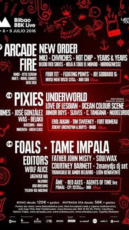 El BBK Live ya se ha subido al carro de los festivales que más público atraen, con su lado bueno y otro no tan positivo. Este año, entre los días 7 y 9 de julio, llevan a 44 bandas, como viene acostumbrando, habituadas a los hits y mezclando grandes grupos con muchos años de trayectoria con jóvenes bandas de moda, o de música electrónica. Sin duda, destacan los americanos Pixies. La banda liderada por Black Francis, surgida con fuerza en los ochenta, cuando marcaron tendencias en el mundo del rock alternativo y punk, encabeza la lista del viernes. Pero el jueves hay dos grandes nombres: los canadienses Arcade Fire y otra de esas bandas que marcaron el sonido de los ochenta, New Order. También los muy reconocibles M83, ya en este siglo, o Chvrches, la música electrónica de Hot Chip o Years & Years, junto con Blood Red Shoes.