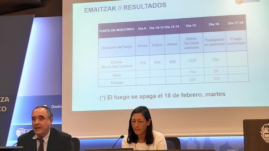 Durante la presentación de los resultados, han mostrado una tabla señalando que, por ejemplo, el día 9, con el fuego activo, los valores de dioxinas en el barrio de San Lorenzo, de Ermua, se encontraban en 719 fentogramas. Su pico más elevado fue el día 15 -cuando se inicia la extinción- con 1.200 fentogramas. Estos últimos resultados han mostrado que el día 16 -cuando comienzan las labores de extinción, pero el fuego aún no está extinto- las mediciones muestran 730 fentogramas.