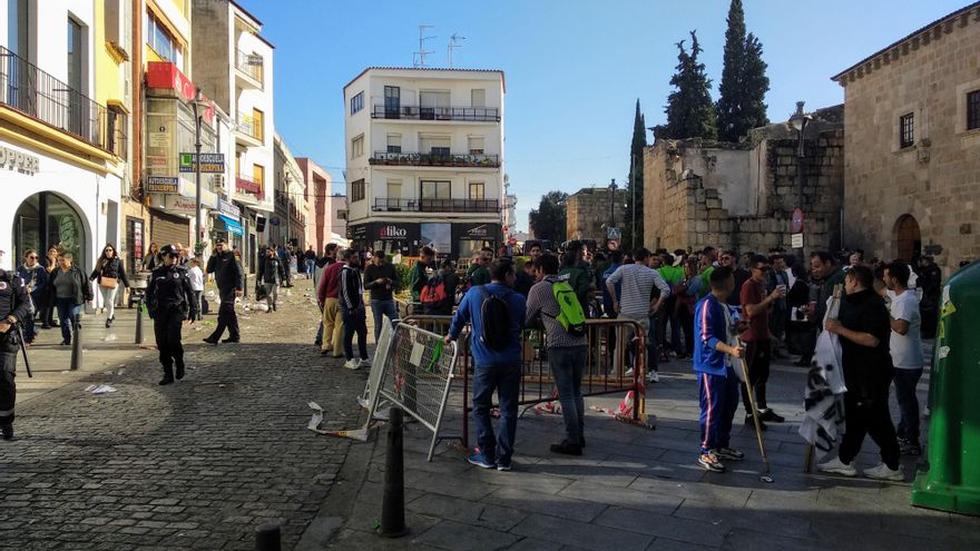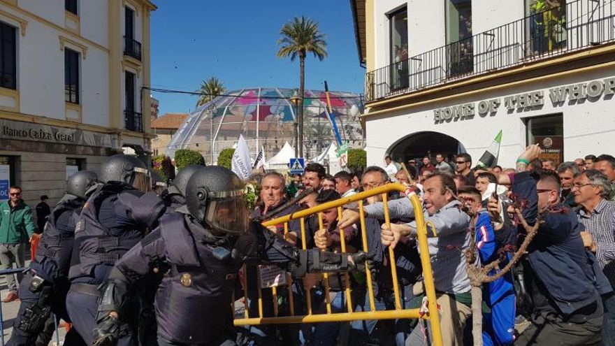 Ha acabado en forcejeos, algunos porrazos por parte de los agentes antidisturbios, y lanzamiento de objetos uno de los cuales, una botella de cristal, ha impactado en la boca de un reportero gráfico de Canal Extremadura, que ha resultado herido y fue atendido por Cruz Roja, sin heridas importantes.