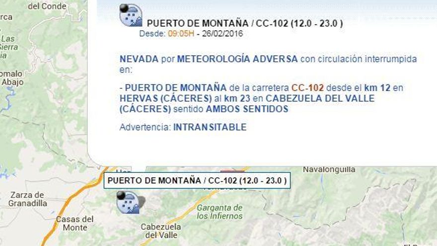 La acumulación de nieve en el norte de la provincia de Cáceres, en alerta amarilla por este fenómeno adverso, ha obligado a cortar al tráfico en el puerto de montaña (Puerto de Honduras) de la carretera CC-102 desde el kilómetro 12 en Hervás al kilómetro 23 en Cabezuela del Valle, en ambos sentidos.